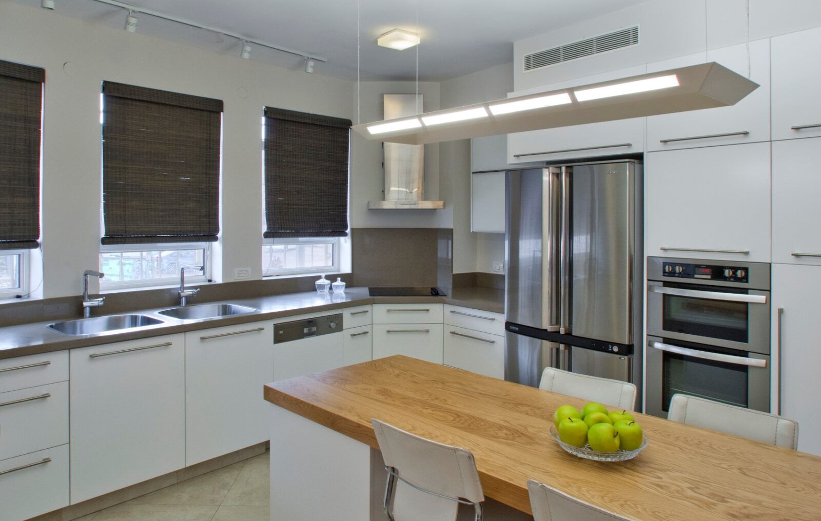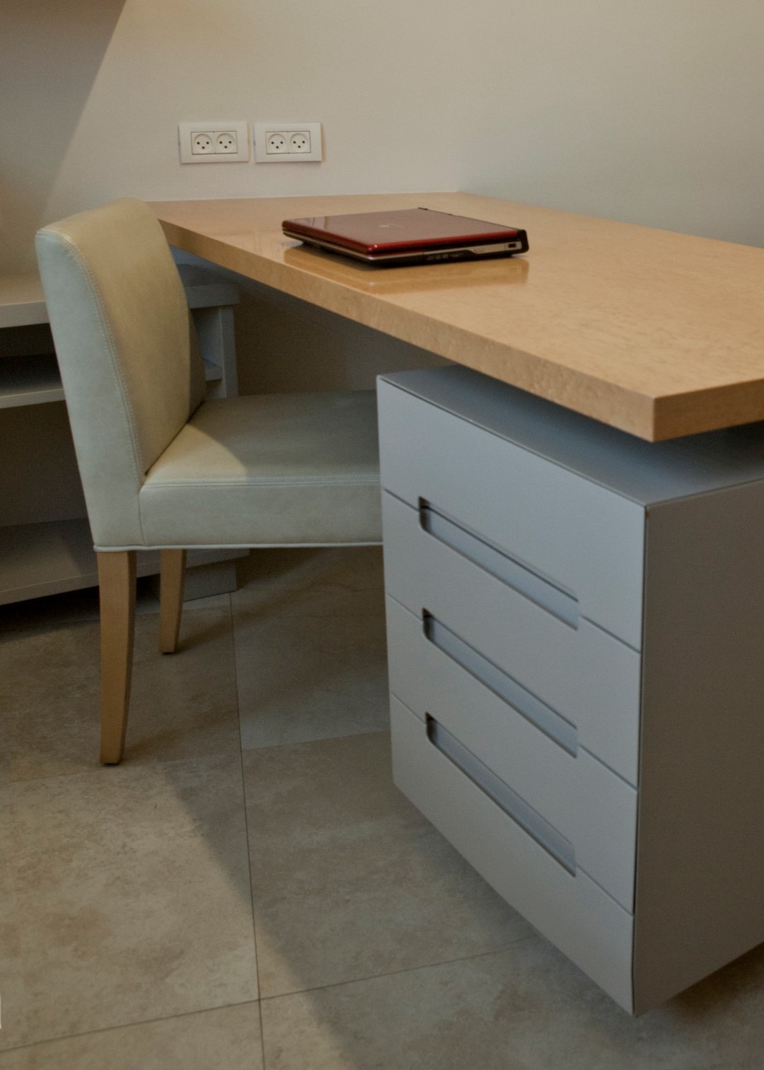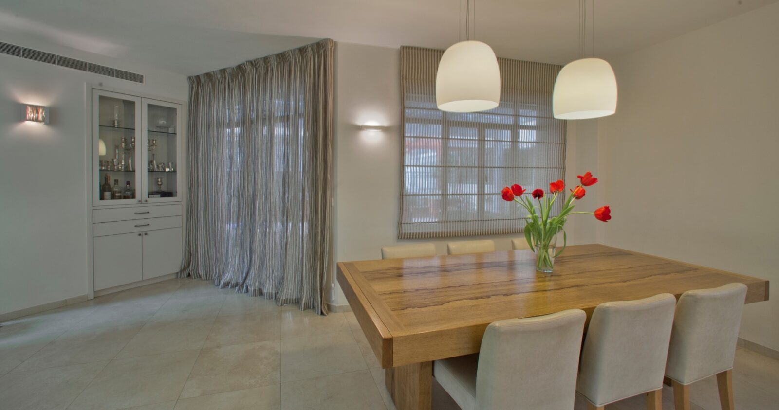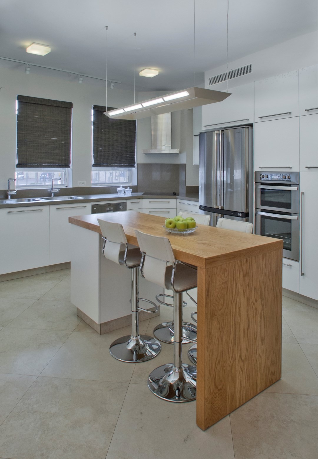 תכנון ועיצוב בית פרטי בירושלים, 200 מ"ר, בעל שלוש קומות עבור משפחה גדולה המארחת תכופות. הבית תוכנן בהתאמה מלאה לדייריו ולבקשתם לבית נעים ופונקציונלי. כדי ליצור מבואת כניסה יפה הופרד החלל בעזרת קיר נמוך. קומת הכניסה תוכננה כך שתכלול את הסלון, פינת האוכל והמטבח באופן כזה שתיווצר זרימה טובה בין הפונקציות. במטבח שבוצע על ידי חברת "המטבח" שולב אי ישיבה מרכזי. גרם מדרגות בעל חלון צר וארוך, מחבר בין הקומות. הדגש בפרוייקט עמד על פתרונות אחסון רבים וחללים נעימים וקלים לתחזוקה המתאימים לארוח תכוף. הבית מאופין בשימוש בצבעוניות בהירה ואחידה ובחמרים טבעיים. הריהוט תוכנן במיוחד, חלקו נרכש בחנות "האסם" וחלקו בוצע על ידי נגר אומן. התאורה שנרכשה מ"קבסו תאורה" מאד מגוונת – מגופי תאורה המפיצים אור חזק ועד גופים המשמשים כתאורת אוירה